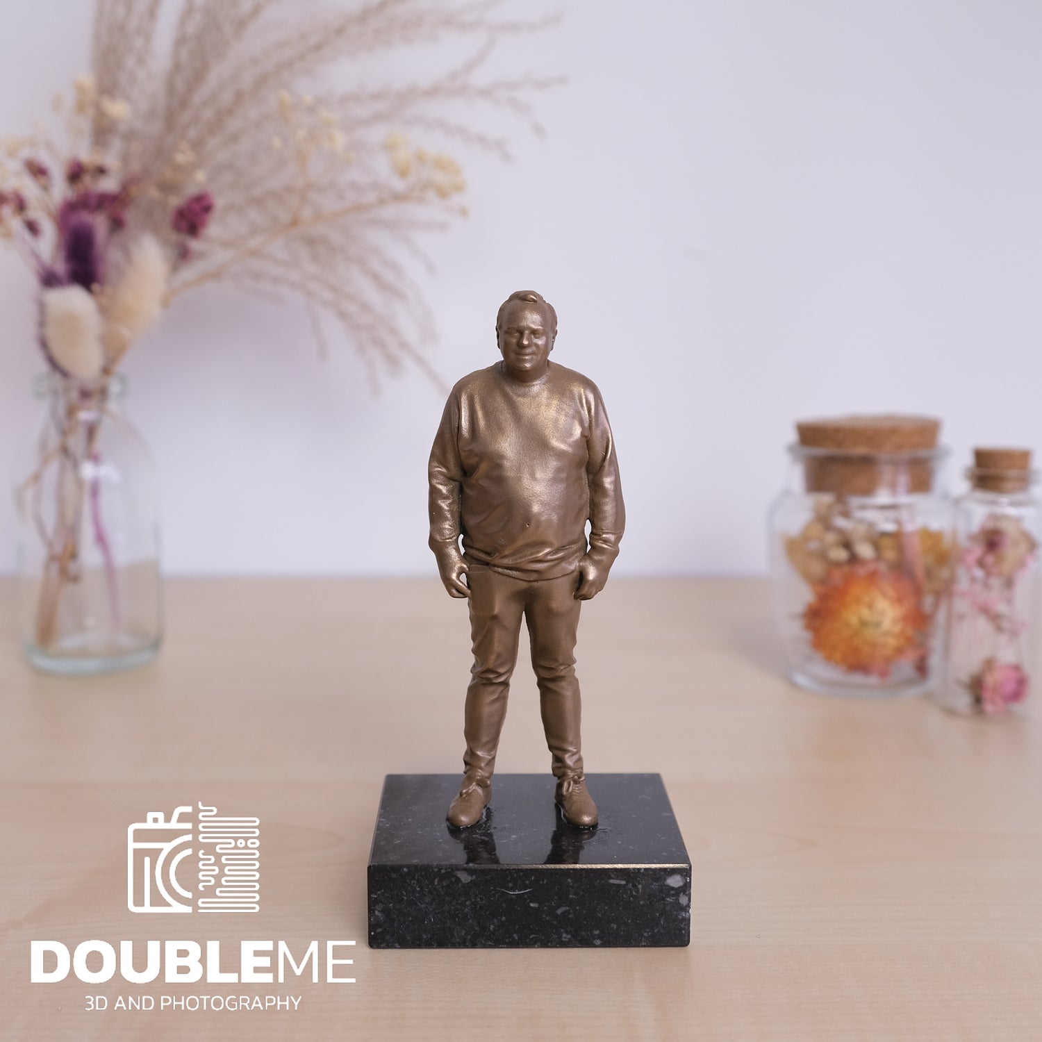 Een echt standbeeld(je) van jezelf of van jouw familie/vrienden. In een brons look kleur lijkt het net op een echt brons beeld, alleen dan voor minder geld. Daarbij hou je in deze vorm veel meer detail in het beeldje omdat de bovenste laag in dit geval minder dik is dan bij een echt brons beeld.